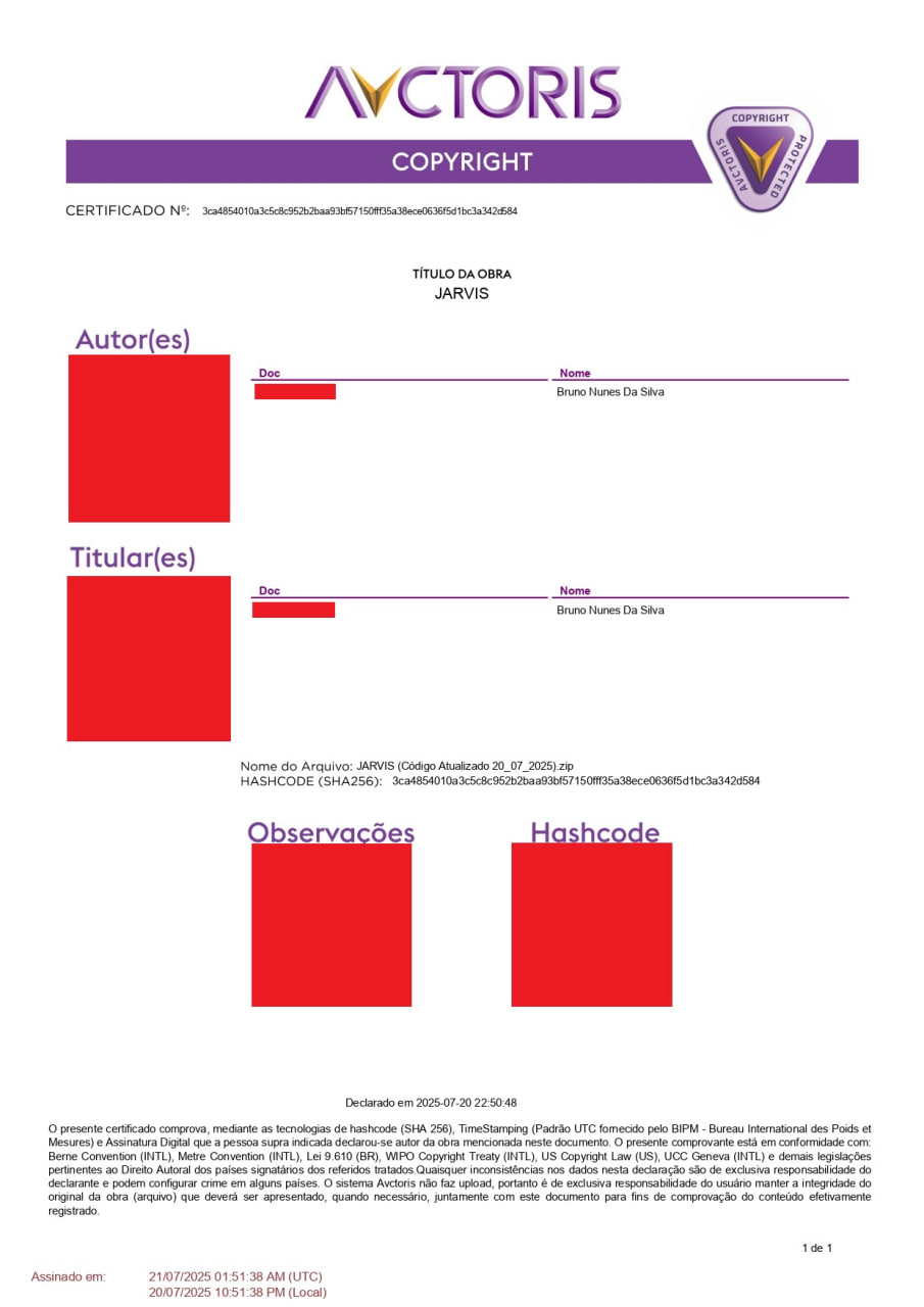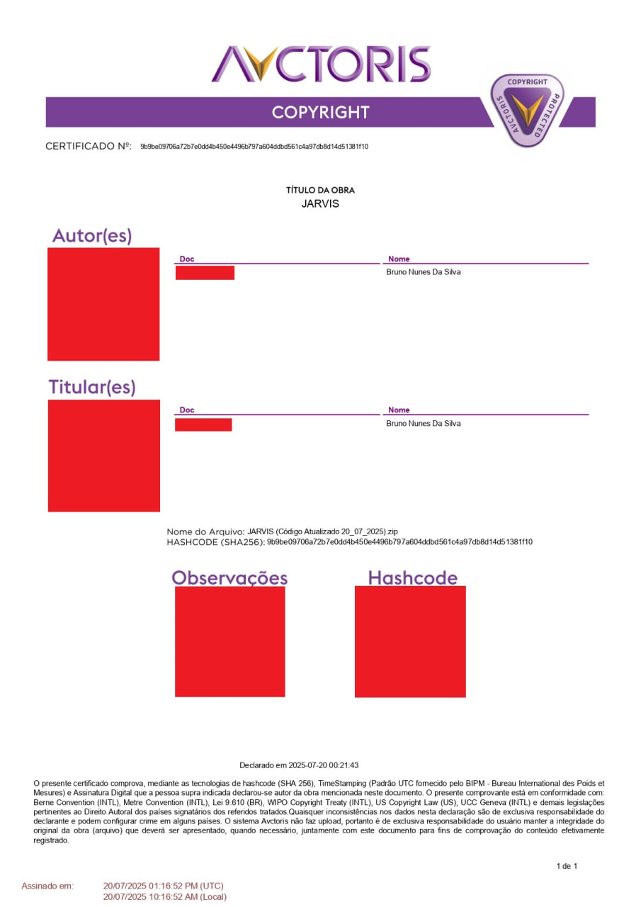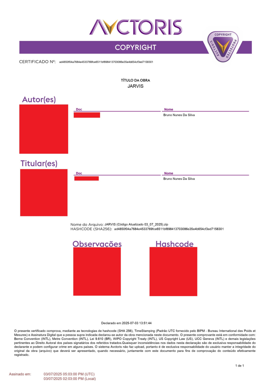 Garante os direitos autorais do desenvolvedor sobre todo o conteúdo do JARVIS.